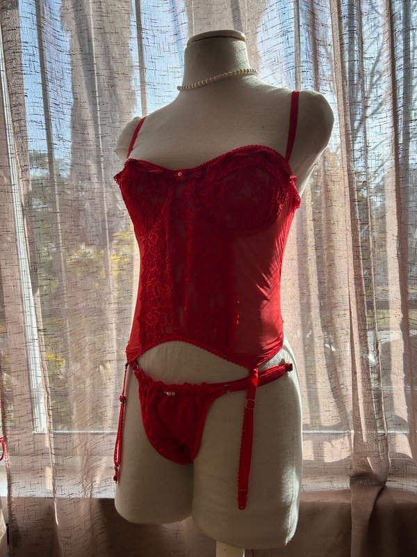 Set de dos piezas. Corset hecho con puntilla de encaje y microtul, con detalles en encaje fino y perlas. Bombacha a juego con breteles regulables.