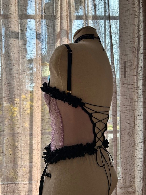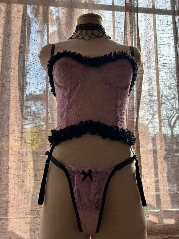 Set de dos piezas. Corset hecho con puntilla de encaje lila y detalles de encaje fruncido negro
